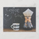 Ein Kalkbrett im Hintergrund sagt "Kaffeezeit" mit einem Smiley, geschrieben in Kreide. vorne auf einem rustikalen Holztisch ist eine Kaffeemaschine mit einem Diamantenmuster-Design in Schwarz-Weiß. Neben der Kaffeetasse sitzend eine Kaffeekanne mit großem Filter und einer frisch gebrühten Kaffeekanne. Sieht rustikal und alt aus.