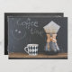 Kaffee Thema zusammen kommen / Party Einladung. Ein Kalkbrett im Hintergrund sagt "Kaffeezeit" mit einem Smiley, geschrieben in Kreide. vorne auf einem rustikalen Holztisch ist eine Kaffeemaschine mit einem Diamantenmuster-Design in Schwarz-Weiß. Neben der Kaffeetasse sitzend eine Kaffeekanne mit großem Filter und einer frisch gebrühten Kaffeekanne. Sieht rustikal und alt aus. Die Rückseite der Einladung ist für Sie individuell einstellbar, um alle Ihre Party-Details, auf eine Chalkboard-Textur gestalten.