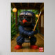 Kagu Kendo Meister Dieses Bild ist von einem stilisierten, Yanbaru Kuina Vogelcharakter gekleidet in traditioneller Kendo-Rüstung. Der Charakter trägt eine dunkelblaue Kendogi (Uniform), einen schützenden Bug (Rüstung) mit einer Gesichtsmaske und helle rote Schuhe. Sein Gesicht ist ein stilisierter Schnabel, und es hält ein Shinai (Bambusschwert) in seinen Händen. Der Hintergrund scheint ein traditionelles japanisches Dojo oder Gebäude mit Bambusboden, Holzsäulen und an der Decke hängenden Papierlaternen zu sein. Im Hintergrund sind üppig grüne Pflanze zu sehen, was auf einen tropischen oder äußeren Rahmen schließen lässt. Der Charakter wird so gestellt, als ob er bereit wäre zu üben oder Duell.
