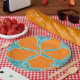 Eine wunderschöne moderne Illustration von Hibiskus-Blume mit Stift- und Tintentechnik. Inspiriert von den Hawaiianischen Boards und Aloha-Shirts der 50er und 60er Jahre. Es gibt andere Zuhause-Dekorationselemente im selben Design. Das Muster kommt in mehreren Farben. Die Papierservietten koordinieren sich mit den Tellern.