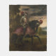 Dieses Design zeigt ein Gemälde des italienischen Malers der Renaissance Titian (1488-1576), der oft als das wichtigste Mitglied der Venezianischen Schule des 16. Jahrhunderts gilt. Es zeigt Kaiser Karl V., den Heiligen Römischen Kaiser, auf dem Pferd in der Schlacht von Mühlberg, die 1547 während des Schmalkaldischen Krieges stattfand. Die Kämpfe fanden in Mitteleuropa statt, in der Region des modernen Deutschlands. Charles V hält einen Lanze und trägt einen vollen Anzug Rüstung, einschließlich eines Helms, während er mit seinem schwarzen Pferd in den Kampf fährt. Das Pferd trägt einen eleganten roten Mantel aus opulenten Stoffen. Das ursprüngliche Kunstwerk wurde 1548 von Tizian gemalt und befindet sich heute im Prado Museum in Madrid, Spanien.