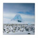 Dieses Foto kennzeichnet eine Kaiser Penguinkolonie mit gefrorenen Eisbergen als Hintergrund.