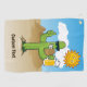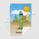 Cartoon von lächelnden Kakteen mit Sonnenbrillen in der Wüstenlandschaft, die eine Bierkaktus halten und Daumen geben. Benutzerdefinierter Text.