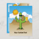 Cartoon von lächelnden Kakteen mit Sonnenbrillen in der Wüstenlandschaft, die eine Bierkaktus halten und Daumen geben. Benutzerdefinierter Text.