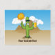 Cartoon von lächelnden Kakteen mit Sonnenbrillen in der Wüstenlandschaft, die eine Bierkaktus halten und Daumen geben. Benutzerdefinierter Text.