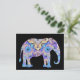 Ein schön gemusterter Kaleidoskop-Elefant schmückt diese Postkarte. Der Elefant ist in türkisfarbenen, lila, goldenen, lavendelfarbenen und weißen Marmortönen gehalten.