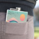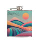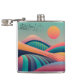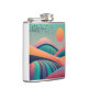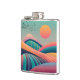 Eine abstrakte Landschaft von sanften Hügeln in lebhaften Farben mit kühnen Texturen und einem Vogelschwarm am Himmel.