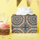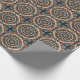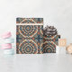 Ein lebendiges geometrisches Quiltmuster strahlt von der Mitte aus und schafft ein faszinierendes Mandala-Design mit verschiedenen Farbtönen, darunter aquamarine Grüntöne, Rostbraun und Beige
