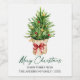 Moderne elegante Kaligrafie-Tinte Schriftzug Frohe Weihnachten Wein-Label mit Wasserfarbe-Kiefer in einer Papiertüte mit rotem Band-Schleife, goldenen und roten Weihnachtsdekorationen.