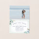 Moderne Kalligraphie Save the Date auf der Vorderseite. Individuell gestaltetes Foto und moderne Aquarellbilder mit einem wunderschönen Bouquet aus anemonischen Blume, Hydrangea, Eukalyptus, Blätter und Zweigen im Inneren. Elegante Schriftart-Kombination. Originelles Thema: aquamarin, hellblau, tiefblau, hellgrün, beige, ecru, weiß. Einfaches und elegantes Hochzeitstil. Ideal für elegante Hochzeit, Blumenhochzeit.