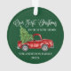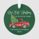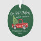 Moderne Fun Calligraphie Drehbuch Unsere ersten Weihnachten in unserem New Zuhause Ornament beinhaltet Watercolor Vintag Red Truck mit Weihnachtsbaum. Grüner Hintergrund des Waldes.