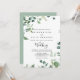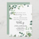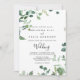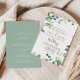 Diese kalligraphische Schrift-Vorder- und Rückseite der Hochzeitseinladung ist perfekt für eine moderne Hochzeit. Das Design ist mit Aquarellfarben handgezeichnet eleganten botanischen Eukalyptuszweigen und Blätter, die in schönen Bouquets und geometrischen Mustern angeordnet sind. Rett Papier, indem man mehr Details auf der Rückseite der Einladung anstatt auf einer separaten Gehäusekarte angibt.