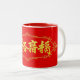 Eine minimalistische Tasse mit den chinesischen Schriftzeichen "幸 福" (Glück) in Gold auf fett rotem Hintergrund. Ideal, um das ganze Jahr über Glück und Wohlstand zu bringen.