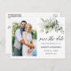 Moderne Kalligrafie Script Elegant Watercolor Botanische Grüne Hochzeitsszenarien Verlobung Announcement Foto Save the Date Postcard beinhaltet Eukalyptus-Blätter, grünes botanisches Blattwerk, staubblaue Blätter und andere schöne botanische Vegetation.