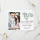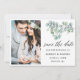 Moderne Kalligraphie-Script, elegante Watercolor Botanische Eukalyptus-Blätter, Grün-Save the Date Verlobung Ankündigung Couple Foto Card