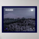 Die Aussicht von meiner Berghütte im Idaho Panhandle; auf dem Katka Berg in der Nähe der Stadt Bonners Ferry. Das Mondlicht, das immer ein wenig von Wolken verschleiert wird, reflektiert die schneebedeckten Berge. Nadelbäume bedecken die Landschaft. Es erscheint auch das Textlesen "IDAHO". Sasquatch wohnt hier.