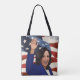 "Portrait der Präsidentschaftskandidatin Kamala Harris mit den US Flagge und dem Wind hinter ihr."