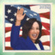 Portrait der Präsidentschaftskandidatin Kamala Harris mit den US Flagge und dem Wind hinter ihr.