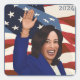 Portrait der Präsidentschaftskandidatin Kamala Harris mit den US Flagge und dem Wind hinter ihr.