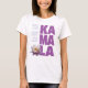 Kamala mit einer Lotus-Blume und dem Sanskrit-Sinn ihres Namens mit der Bedeutung der Lotus-Blume. "Kamala ist ein Sanskrit-Wort, das Lotus bedeutet. Es ist einer der Namen der Göttin Lakshmi, die aus der Mitte eines Lotus erscheint. Die Lotus-Blume wird oft mit den Themen der Schöpfung und Wiedergeburt in Verbindung gebracht. Seine einzigartige Fähigkeit, aus den schlammigen Gewässern herauszukommen, aber unberührt und rein zu bleiben, symbolisiert den zyklischen Prozess der Geburt, des Wachstums und der Erneuerung."