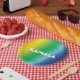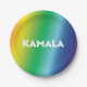 Kamala Regenbogenverlauf Muster moderne Typografie lgbtq lgbt Gay Pride Party Papier Teller. Weißer, fett formatierter Text mit Farbverlaufsfarben im Hintergrund.