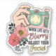 Laptop-Aufkleber mit Kamera und Blume und inspirierender Text: "Wenn das Leben verschwommen wird, passen Sie Ihren Fokus an."