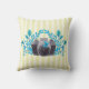 Ein Kissen mit niedlicher Aquarellgestaltung für Shutterbugs. Eine schwarze Kamera, umgeben von azurblauen Blätter und Schmetterlingen in einer hübschen Dekoration. Set auf einem hellpastellgelb gestreiften Hintergrund.