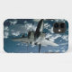 Großes Foto eines Kampfjets am Himmel. Große Einnahme mit schönen Wolken und Inseln sichtbar auf dem Boden.