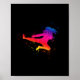 Die weibliche Kampfkünstlerin fliegt mit einem hohen Tritt durch die Luft. Mehrfarbige Silhouette und Farbspritze.