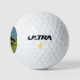 Dieses Golfball-Design verfügt über ein Foto von mehreren kanadischen Gänsen, darunter zwei erwachsene Vögel und mehrere Goslings. Sie sind auf grünem Gras in der Nähe des Ufers von etwas bläulich-grauem Wasser stehend.