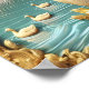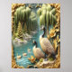 Zwei majestätische kanadische Gänse stehen an einem ruhigen Flussufer, umgeben von üppigen, weinenden Wildbäumen, die elegant über das friedliche Wasser ziehen, wo die Entenlinge sanft paddeln. Goldene Blume blühen auf verzierten Rahmen und fügen der Dämmerszene eine Touch von Launen hinzu.