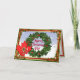 Feierliche Feiertage aus Kanada und Kanada. Hübsche Gold- und Rotwände haben heilige Scrollecken. Schneebedeckter Hintergrund mit heiligem Kranz und kanadischer Biberflagge vor rotem Mapleleaf. Text sagt: Frohe Weihnachten Eh! Passen Sie die Gruß- und Schließbereiche an. Verse dich drinnen.
