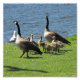 Dieses Design umfasst ein Foto von einer Reihe kanadischer Gänse, darunter zwei erwachsene Vögel und mehrere Goslings. Sie sind auf grünem Gras in der Nähe des Ufers von etwas bläulich-grauem Wasser stehend.