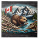 Ein kanadischer Biber steht auf einem Baumstamm in der Nähe eines Flusses, umgeben von Bäumen und Bergen, und die kanadische Flagge weht im Hintergrund.