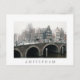 Foto Postkarte eines Kanals mit einer Brücke, traditionelle Häuser und Fahrräder im Winter unter Schnee in der niederländischen Hauptstadt Stadt, Amsterdam, Niederlande mit einer weißen Grenze und dem Text 'Amsterdam'.