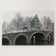 Foto-Puzzle mit einem Kanal mit einer Brücke, traditionelle Häuser und Fahrräder unter einem Schnee im Winter in der niederländischen Hauptstadt Stadt, Amsterdam in den Niederlanden.