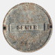 Ein Metall, wahrscheinlich Stahl, Abwassermanlochdeckel in einer Straße. Spaß Aufkleber überall und überall hinstellen! Bauarbeiter, Instandhaltung, Straßenarbeiter, haben Spaß, diese in willkürlich seltsamen Orten bei der Arbeit zu setzen! Sehen Sie mehr über unsere Konstruktions- und Abwasserentwürfe in unserem Geschäft.