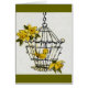 Niedlicher kleiner gelber Kanarienvogel in einem altmodischen Käfig mit gelben dafodills. Großer Entwurf für alle Arten Gelegenheiten.
