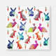 Aquarellkaninchen in verschiedenen Farben, Karotten, Osterstimmung, individueller Hintergrund.