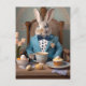 Kaninchen in blauem Mantel mit Nachmittagstee