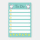 Niedlich, liebenswert aquamarin, um Listen zu machen. Auf jeder Seite dieser Notelets befinden sich zwei kleine, weiße Hasen mit einer orangefarbenen Karotte. Jedes Kaninchen hat ein Ohr oben und ein Ohr taucht ab. Sie haben kleine rosa Zehen und rosige Wangen. In dem Raum zwischen den Bundnies sind die Worte To Do in einem dunklen aquamarinen Text. Unter den Kaninchen sind sieben weiße Räume, um Ihre Notizen mit einem gelben Stern am Anfang jedes Raumes zu schreiben. Dann am Ende der Noten ist eine Reihe von gelben Blumen, um dieses kawaii-Design zu beenden.