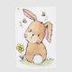 Niedliches, bezauberndes, braunes Hasen mit einem weißen, flauschigen Schwanz, der neben einer gelben Blume sitzt und um seinen Kopf stolpert Hummeln. Originelle Kunst in Aquarellfarben.