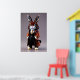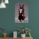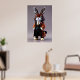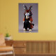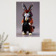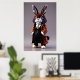 Ein niedliches und bezauberndes, plüschiges Spielzeughasen in einem schwarz-weißen Anzug mit einer Krawatte und einem braunen Mantel. Das ist eine künstlerische KI.