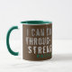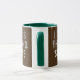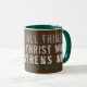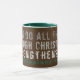 Die Tasse des Kaffees mit Christlicher Schrift von den Philippinen, "Ich kann alles durch Christus machen, der mich stärkt", wird über Braun gedruckt. Text ist modern grunge, oder bekümmert, und umschließt die Tasse. Der Griff und die Innenfarbe sind grün und können gewechselt werden, oder Sie wählen eine andere Kaffeemaschine Tasse.