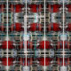 Bunte Rolle der Schnarrtrommeln gestapelt und mit Ziegeln gedeckt.