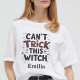 Moderne Halloween-individuelle Name-Shirt-Design-Features wie "Can't Trick This Hexe"-Text in schwarzer Kalligraphie-Stil Typografie. Macht ihr das personalisiertste Halloween-Geschenk - eure Freundin, Schwester oder sogar eure Nachbarin! Perfekt, um sie sich ganz besonders zu fühlen, ihr Vertrauen zu stärken und ein einzigartiges und bequemes Geschenk zu bekommen!