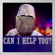 Nahaufnahme eines Helms und einer Plattenrüstung eines mittelalterlichen Ritters vor dem farbenprächtigen Hintergrund, der den Weltraum oder ein Schlachtfeld nach Ihren Wünschen imitiert. Text - Kann ich Ihnen helfen - hinzugefügt