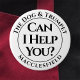 Ein Abzeichen für Mitarbeiter, Sprichwort "Kann ich dir helfen?" Ändern Sie den Wortlaut in Ihre Details. Abzeichen des Personals. Offizielles Abzeichen mit schwarzer Schrift auf weißem Hintergrund.