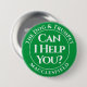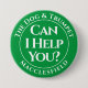 Ein Abzeichen für Mitarbeiter, Sprichwort "Kann ich dir helfen?" Ändern Sie den Wortlaut in Ihre Details. Abzeichen des Personals. Offizielles Abzeichen in Grün und Weiß.