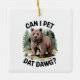 Eine skurrile Abbildung eines Bären mit einem Hundehalsband mit Namensschild, stehend in einer bewaldeten Szene. Der Text über und unter dem Bären lautet auf humorvolle Weise: "Kann ich Dat Dawg essen essen?" Ein spielerisches und kreatives Design, das Spaß und Natur verbindet.